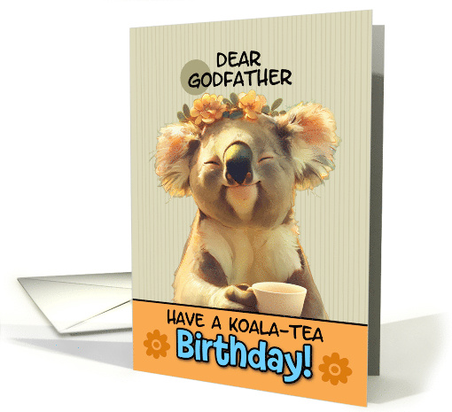 This birthday card features an adorable and whimsical illustration of a koala. The koala is depicted with a content, smiling expression and closed eyes, suggesting a state of blissful relaxation. It's wearing a delicate floral crown of small yellow-orange flowers, adding a touch of cheerfulness to its appearance. The koala is holding a white tea cup, which ties into the pun in the card's message. The background is a soft, striped pattern in a light beige color, giving the card a gentle, warm feel. At the bottom of the image is an orange banner containing the text "HAVE A KOALA-TEA Birthday!" This clever pun combines "koala" with "quality" to create a playful, tea-themed birthday wish.