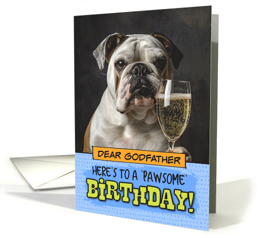 This birthday card features a humorous image of an English Bulldog appearing to hold a glass of champagne or sparkling wine. The dog has a characteristic wrinkled face with a slightly grumpy or unimpressed expression, which adds to the comedic effect. The contrast between the formal champagne glass and the dog's appearance creates a playful and unexpected scene. The card's text reads: "HERE'S TO A 'PAWSOME' BIRTHDAY!" There's also a playful "XOXO" in the corner, representing hugs and kisses. The design uses a blue dotted background for the text area, with "BIRTHDAY" prominently displayed in large, yellow letters.