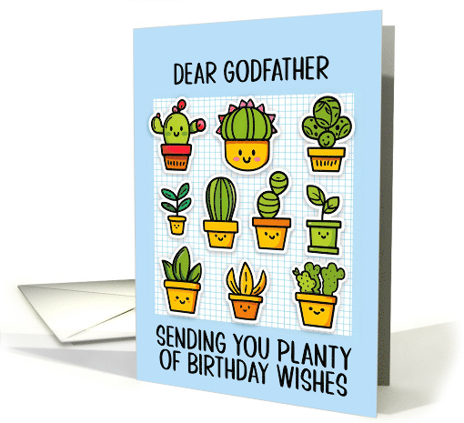 | Artist Notes: | A whole bunch of kawaii cactus and succulent plants in pots on a light blue background with the text "dear godfather sending you planty of birthday wishes". A wonderful birthday card to send to your plant loving godfather |
