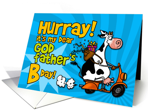 | Artist Notes: | A cute black and white cartoon cow with a birthday present in its backpack riding an orange scooter on a blue striped background with the text "Hurray! it's my dear godfather's B-Day!" |