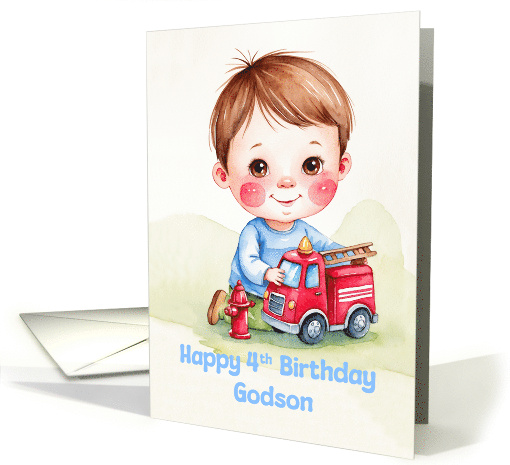 Celebrate a special milestone with this adorable birthday card for a godson. The card features a charming watercolor-style illustration of a happy little boy with rosy cheeks, curly blonde hair, and bright blue eyes. He is dressed in a blue outfit and is joyfully playing with a bright red toy fire truck, symbolizing fun and adventure. The soft pastel background complements the vibrant colors of the fire truck, creating a playful and heartwarming scene. The text, “Happy 4th Birthday Godson,” is displayed in cheerful blue lettering, adding a sweet and celebratory touch. Perfect for loved ones to express their love and excitement, this keepsake card captures the innocence and wonder of a child's first years.
