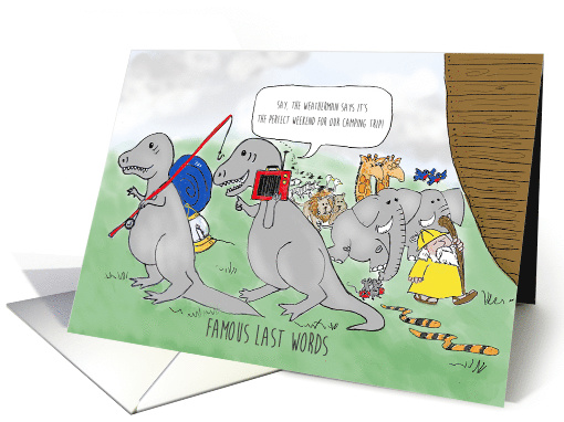 This Good Luck card features two large dinosaurs carrying a sleeping bag, lantern, and fishing pole, ready for a camping trip. Next to them, a row of animals two by two including snakes, elephants, zebra, giraffes, lions, birds, and mice carrying their suitcases follow Noah to the Ark. One dinosaur is listening to the weather on an old radio, and in comic strip style says "Say, the weatherman says it's the perfect weekend for our camping trip". They are obviously making the wrong decision. Inside the message says "Good Luck. I know you'll make the right decision".