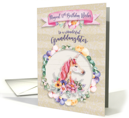 | Artist Notes: | Send sweet Happy 12th Birthday greetings to your granddaughter with this pretty design featuring a unicorn surrounded by colorful flowers on a wreath. |