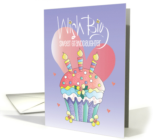 A large pink heart provides a background for the colorful birthday cupcake on this delightful birthday card for your Granddaughter. It is frosted with multiple layers of colored frosting: pink, yellow, blue and white, above the pleated cupcake holder. Yellow flowers add floral highlights to the yummy cupcake, with white hand lettered wording above it that says "Wish Big", in whimsical and curling letters. "Sweet Granddaughter" is tucked into the wording, letting your Granddaughter know how special she is to you. A trio of flaring striped candles angle outward from the top of the cupcake, with round sprinkles decorating the pastry. Pink hearts that match the frosting colors pepper the lavender card. The card's inside wording says "Loving wishes for the happiest birthday ever, where all your dreams come true!"