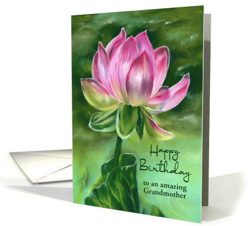 A lovely lotus rendered in soft pastel hues of pink with green foliage on a tranquil pond graces the cover of this birthday greeting that also features recipient text that is easy to personalize with any name for a grandmother.