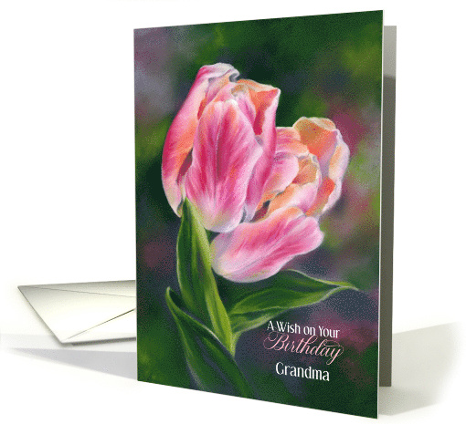 Personalized with any name for your grandmother, like grandma, this vibrant and colorful birthday card design features a pair of tulip flowers in pale pink and orange with rose striations and green foliage on a background of mottled purple and green.