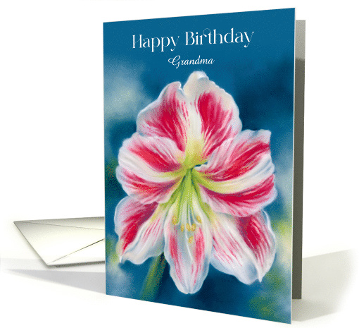 Customizable recipient text allows for a personal touch when you add any word for ‘grandmother’ to the cover of this birthday card. It features floral art in soft pastel shades depicting a large amaryllis blossom in white with streaks of radiant red on a backdrop of indigo blue.