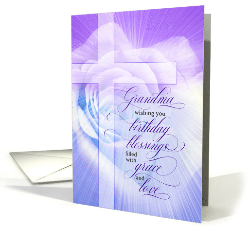 Rays of light shine down on a faded rose in lavender tones and a Christian cross on this beautiful religious birthday card for your grandma.