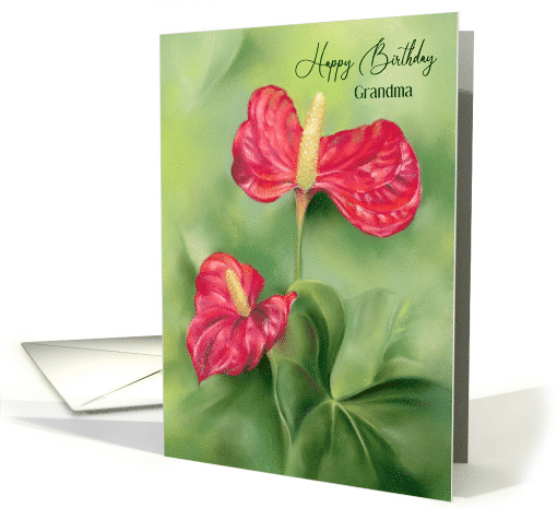 A pair of exotic anthurium blossoms in vibrant red hues rise above green tropical foliage in the soft pastel artwork reproduced on the cover of this beautiful botanical birthday greeting along with recipient text that you can customize for your grandmother, no matter what name she has.