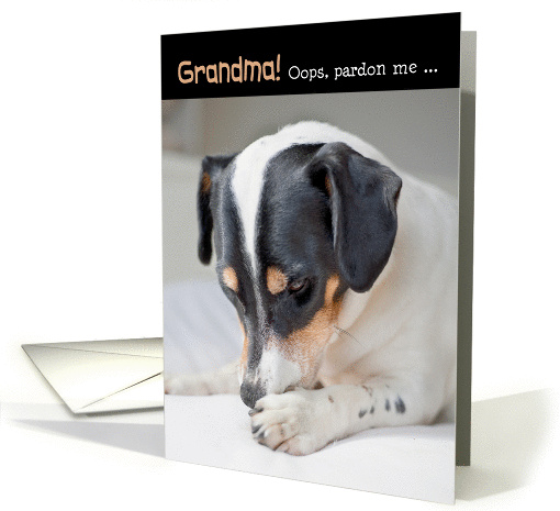 This is a humorous birthday card for grandma featuring a color photographic image of a Jack Russell Terrier dog putting his paw to his nose. At the top of the image in white text on a black border are the words 'Grandma! Oops, pardon me ...' and inside it reads '... I burped' 'HAPPY BIRTHDAY
