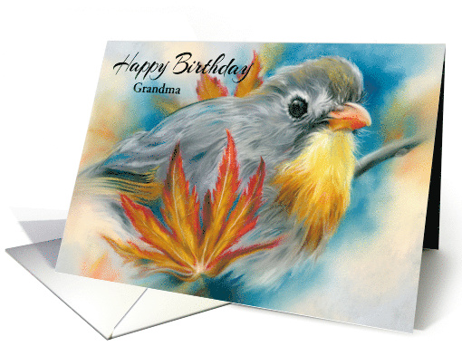 This beautiful bird themed birthday greeting may be personalized on the cover with any name for your grandmother, like grandma. A sweet Japanese nightingale is portrayed in soft pastel bird artwork as it perches in a maple branch with colorful foliage.