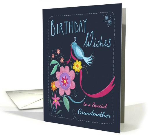 A lovely Birthday card design depicting a beautiful blue bird and flowers on a striking deep navy blue background. Birthday wishes to a Special Grandmother. ©DaleSimpson