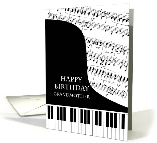 A birthday card for a grandmother who is into piano music. A grand piano with the keys along the bottom of the card. A sheet of music fills the background. A great card for somone who loves music. This is NOT a musical card, it does NOT play music: