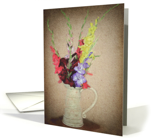 Colorful gladiolus bouquet in old pitcher with textured overly effect for grandmother's birthday.