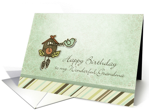 Beautiful light green Birthday card with a cute little Coo Coo clock. This card is designed to give the impression of a handmade scrapbook card, and that all embellishments are rendered digitally.