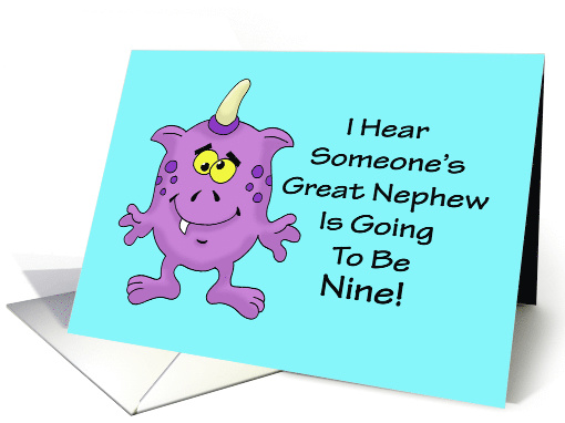 Birthday Card for a great nephew having his ninth birthday with a cartoon of an alien/monster. The words say, I hear someone's great nephew is going to be nine! Inside says, Hope you enjoy your special day!
