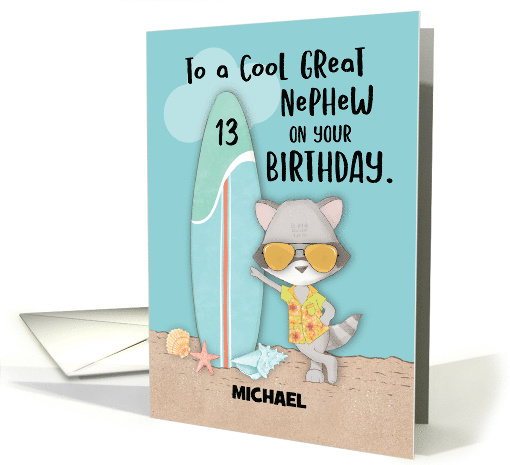 If you intend to send a fun greeting card to your beloved great nephew on his 13th birthday and still undecided what card to send, why not send this one. This card is perfect to give to someone like him who loves the beach. Let him enjoy his special day with the cool raccoon on the cover.