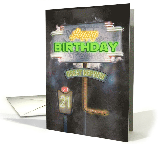 Give your great nephew a retro themed 21st birthday greeting with this design featuring a pair of vintage looking neon road signs at night surrounded by a smoke effect.