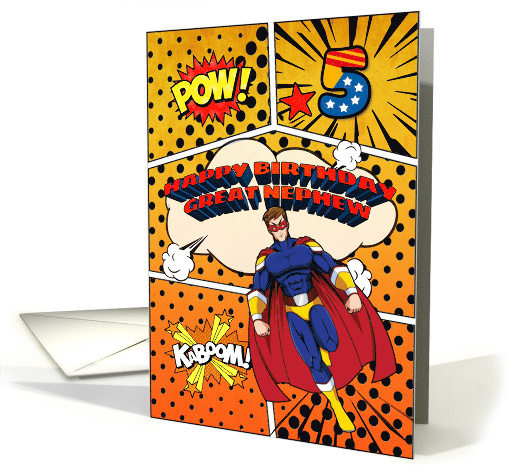 Your great nephew is sure to love this 5th birthday design featuring a superhero comic strip scene complete with a caped superhero, word art pow and kaboom, and a big cloud.