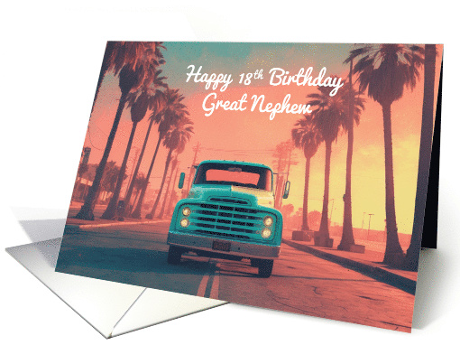 Celebrate a special milestone with this striking 18th birthday card for a great nephew. The artwork features a vintage teal pickup truck with gleaming chrome accents, parked on an iconic palm-lined boulevard. The sun sets in the background, casting a warm, dreamy glow across the sky, which blends soft coral, golden orange, and hints of teal. The phrase "Happy 18th Birthday, Great Nephew" is beautifully written in crisp white script, standing out against the vibrant sunset. The scene exudes a nostalgic, cinematic feel, inspired by classic Americana and the open-road spirit of adventure. This digital pop-art-inspired design captures the essence of stepping into adulthood, symbolizing freedom, excitement, and the journey ahead. Perfect for a young man who appreciates vintage cars, road trips, and bold aesthetics, this card is a stylish and meaningful way to mark the beginning of a new chapter in life.