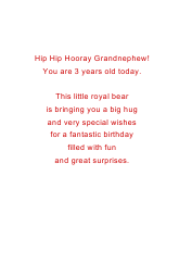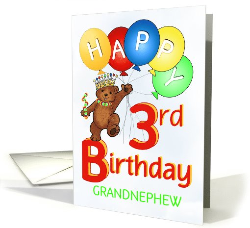 Playful royal teddy bear wearing a princely crown of blue, yellow, red, and green jewels holding a colorful array of balloons and dancing on the birthday B is a fun happy 3rd birthday card for your grandnephew. Customize text for any relation. Original design by Anura Design Studio.