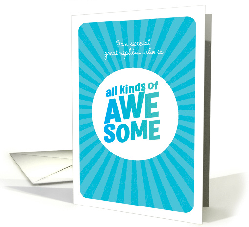 | Artist Notes: | Wish a special great nephew in your life Happy Birthday with this card that's bursting with awesome-ness, just like him! He's just great in so many ways. Ombre blues and turquoise sunburst background highlights your "all kinds of awesome" message. He'll feel the love and appreciation with this card. |