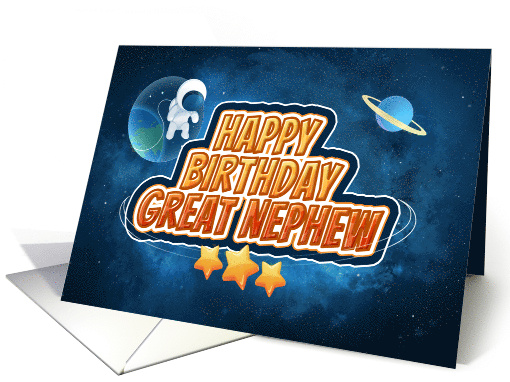 Give your great nephew out of this world birthday greetings with this astronaut hovering in outer space among the stars and planets.