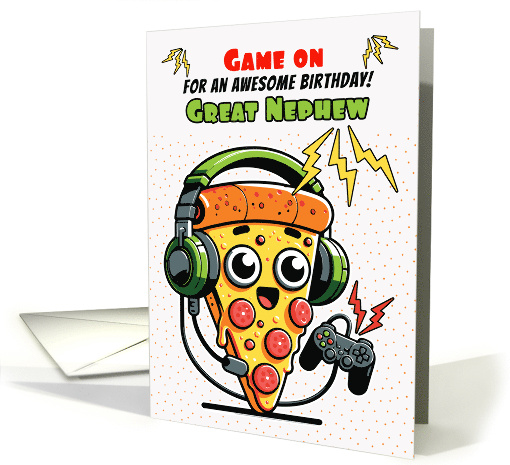 Give fun birthday greetings to your great nephew with this pizza guy gamer with headphones and a video game controller. The design also includes colorful lightning bolts.