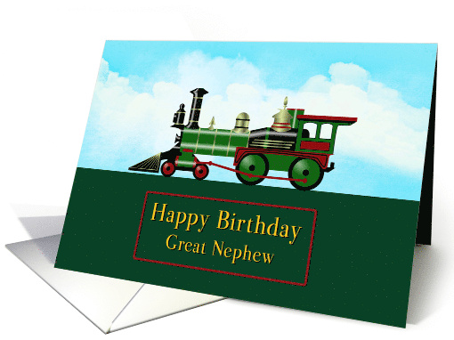 Say Happy Birthday to your great nephew with a colorful image of a cow catcher steam engine. The steam engine is sitting on a dark green block with a beautiful blue and white clouds in the background. The text is "Happy Birthday Great Nephew".