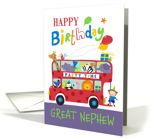 Great Nephew Birthday Card with a fun red bus filled with cute animal characters in bright bold colours. ©DaleSimpson