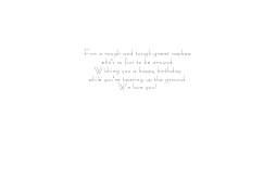 | Inside: | For a rough and tough great nephew who's so fun to be around. Wishing you a happy birthday while you're tearing up the ground. We love you! |