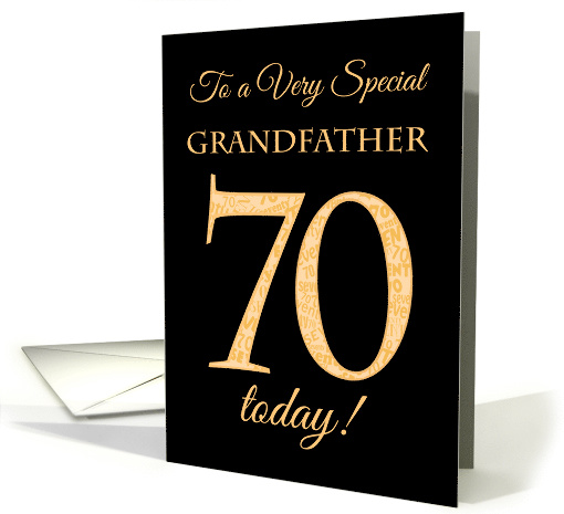 A chic 70th Birthday Card for a 'Very Special Grandfather', with a number 70 composed of gold-effect numbers and the word 'Grandfather', in gold-effect, on a black background. The inside message, which you can change if you wish, is 'Happy Birthday' and other ages can be made on request.