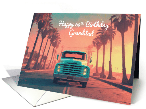Celebrate Granddad’s 65th birthday in style with this beautifully designed vintage-inspired greeting card. A striking turquoise pickup truck sits boldly in the center of a sunlit boulevard, its headlights glowing softly as if ready for the next journey. The warm hues of pink, orange, and teal paint a dreamy sunset sky, creating a nostalgic, cinematic atmosphere reminiscent of golden-hour road trips. Towering palm trees frame the composition, adding depth and elegance to the serene setting. The elegant white cursive lettering delivers a heartfelt birthday message, standing out gracefully against the vibrant background. Perfect for a granddad who appreciates classic cars, road trips, or the timeless charm of Americana, this card blends modern concept pop art with vintage aesthetics, making it a meaningful way to celebrate his milestone 65th birthday with warmth and adventure.