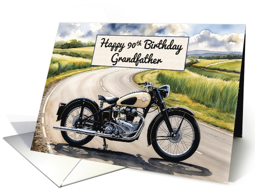 Celebrate your grandfather’s remarkable 90th birthday with this graceful countryside motorbike card, a tribute to a journey filled with heart, resilience, and lifelong devotion. A classic motorcycle rests along a winding rural road, the landscape glowing with golden grasses beneath a tranquil, watercolour sky. The hand-lettered “Happy 90th Birthday” offers heartfelt simplicity. This card honours a grandfather whose presence has been a guiding light through the years—a strong, humble soul whose life continues to inspire and uplift all who know him.