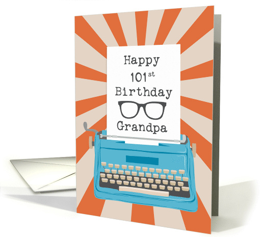A blue vintage typewriter with a sunburst background. A piece of paper from the typewriter which has the words Happy 101st Birthday Grandpa in typewriter font and a silhouette glasses. A retro birthday card for your amazing grandpa turning 101!