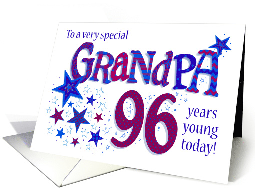 Show your grandfather how much he means to you with this 'star-studded' 96th birthday card! The front cover greeting reads, 'To a very special Grandpa 96 years young today!' and the word, Grandpa and the number '96' are huge and filled with coordinating patterns in shades of blue and Burgundy red. There is a trail of blue and deep red stars leading from the 96 to the beginning of the word, 'Grandpa' and one more patterned star above the final letter 'A'. The inside message is just a suggestion and you can easily add to it, change it or delete it altogether.