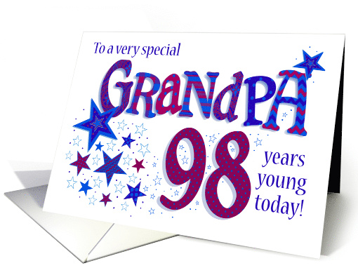 Show your grandfather how much he means to you with this 'star-studded' 98h birthday card! The front cover greeting reads, 'To a very special Grandpa 98 years young today!' and the word, Grandpa and the number '98' are huge and filled with coordinating patterns in shades of blue and Burgundy red. There is a trail of blue and deep red stars leading from the 98 to the beginning of the word, 'Grandpa' and one more patterned star above the final letter 'A'. The inside message is just a suggestion and you can easily add to it, change it or delete it altogether.