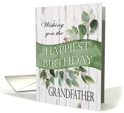 A watercolor banner wishing Grandfather the happiest of birthdays is surrounded by gray and green leaves with berries. The aged wood background gives the card a rustic touch.