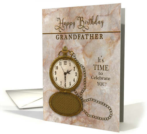 Ideal birthday greeting for that special grandfather. Vintage faux gold/brass pocket watch isolated on a marble background. This one will stand out in the crowd, for sure!