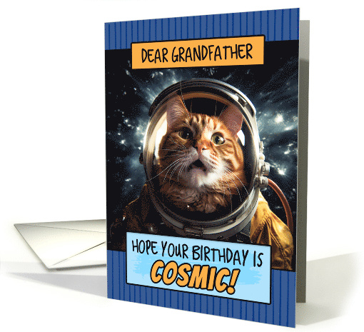 A ginger cat in a space suit is wishing you a cosmic birthday from outer space on a blue striped background. A fun card to send to your wonderful grandfather for their special day.