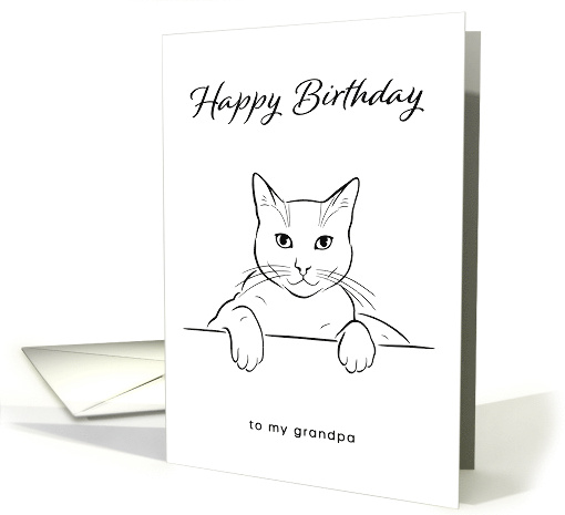 Birthday card for your grandpa, featuring an original minimalist line drawing of a cat on a white background. The front text says 'happy birthday to my grandpa'.