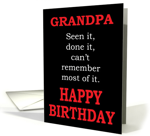 A humorous card for Grandpa's, Featuring a fun message saying "Seen it, done, can't remember most of it." With striking white and red text on a black background. Put your own special Birthday Greeting inside.