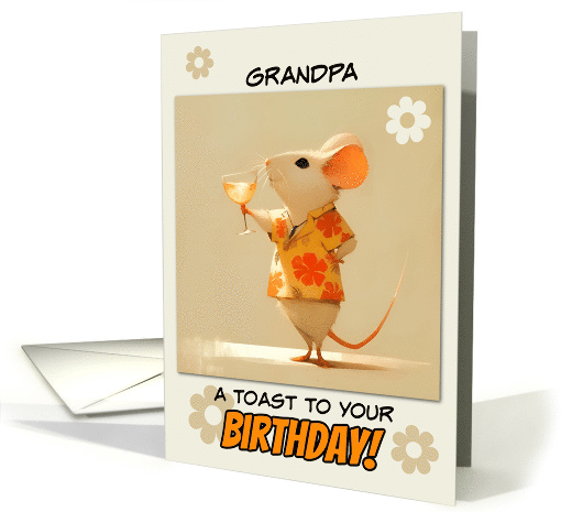 A sweet little rat in a hawaii flower shirt is lifting a cocktail glass in your honor on a beige background with a flower pattern and the text "A toast to your birthday!" A fun card to send to your wonderful grandpa for their special day.