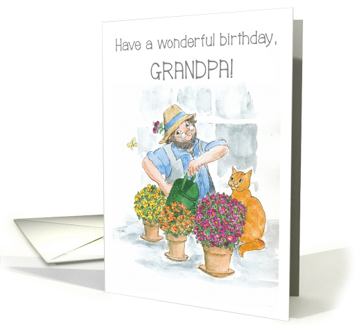 A fun Birthday Card for a grandfather, with a man watering his tubs of flowers in a greenhouse while his cat watches him. The man is wearing a straw hat with a flower in the hatband and a butterfly hovers around him. The text, in grey, says, 'Happy Birthday, GRANDPA!'. From a whimsical hand-painted illustration by Judy Adamson, you can change or delete the inside message.