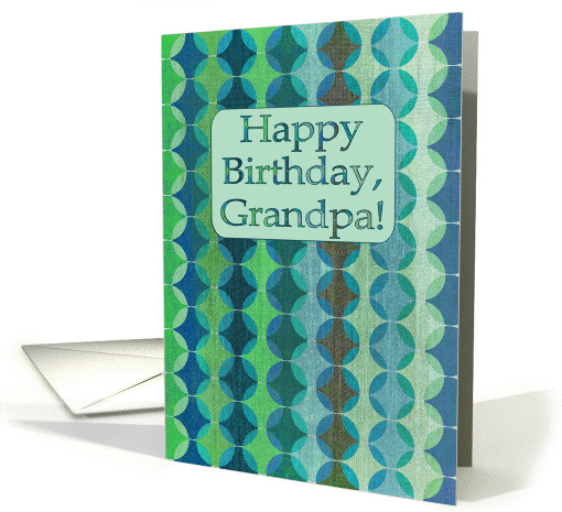 A retro pattern of overlapping circles in shades of mint, green, olive, blue, turquoise, navy, teal, cobalt and lime, with a canvas / fabric texture digitally overlayed. Text reads: Happy Birthday, Grandpa! A simple, funky and modern card, perfect for a hip and special grandfather on his birthday!