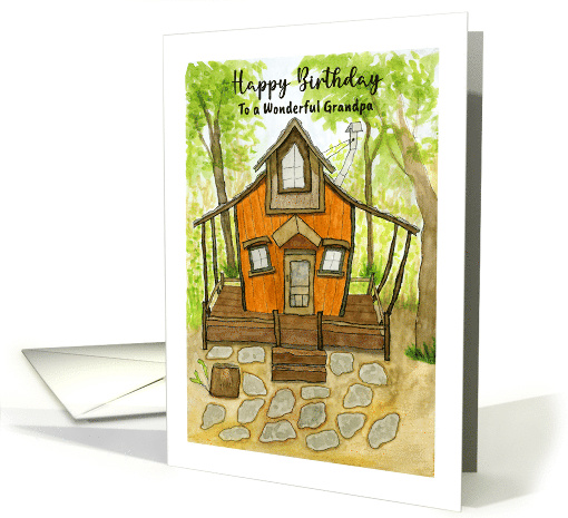 On his special day, send a charming Happy Birthday card to a much-loved Grandfather. This adorable watercolor painting shows a small rustic house nestled in the middle of a shaded forest surrounded by the beauty of the outdoors.