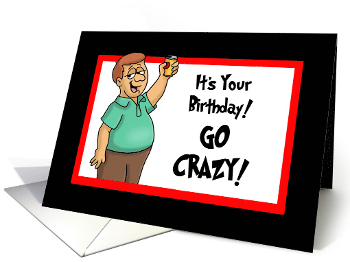 Humorous Grandfather birthday card with a cartoon man raising a beer. The words say: It's your birthday! Go Crazy! Inside says: Go ahead, order a second pudding cup! Happy Birthday, Grandpa