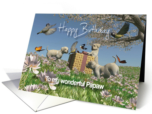 Perfect for the birthday of your animal loving Papaw. Three Labrador puppies are playing with a gift surrounded by birds and butterflies. Inside there is a text which you can customize to something very personal.