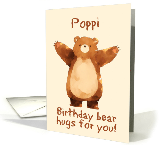 | Artist Notes: | A sweet cartoon bear with it's arms spread wide for an incoming birthday bear hug on a beige background with the text "Poppi birthday bear hugs for you!" A lovely card to send to your wonderful grandpa for their special day. |