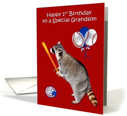 | Title: | 1st Birthday to Grandson, adorable raccoon holding a baseball bat |